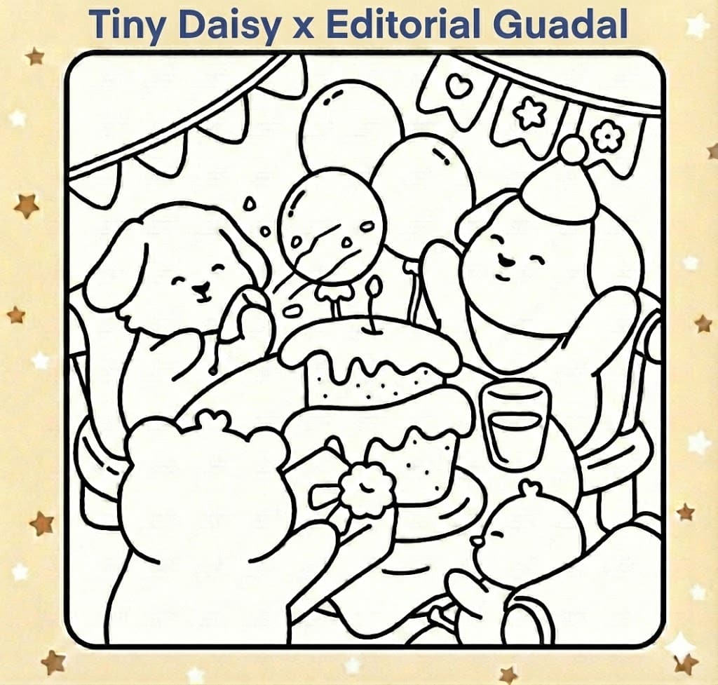 This delightful illustration showcases cute animal friends gathered around a birthday cake, surrounded by balloons and festive decorations. The playful expressions and cosy style reflect the adorable aesthetic that Tiny Daisy Colouring is known for.